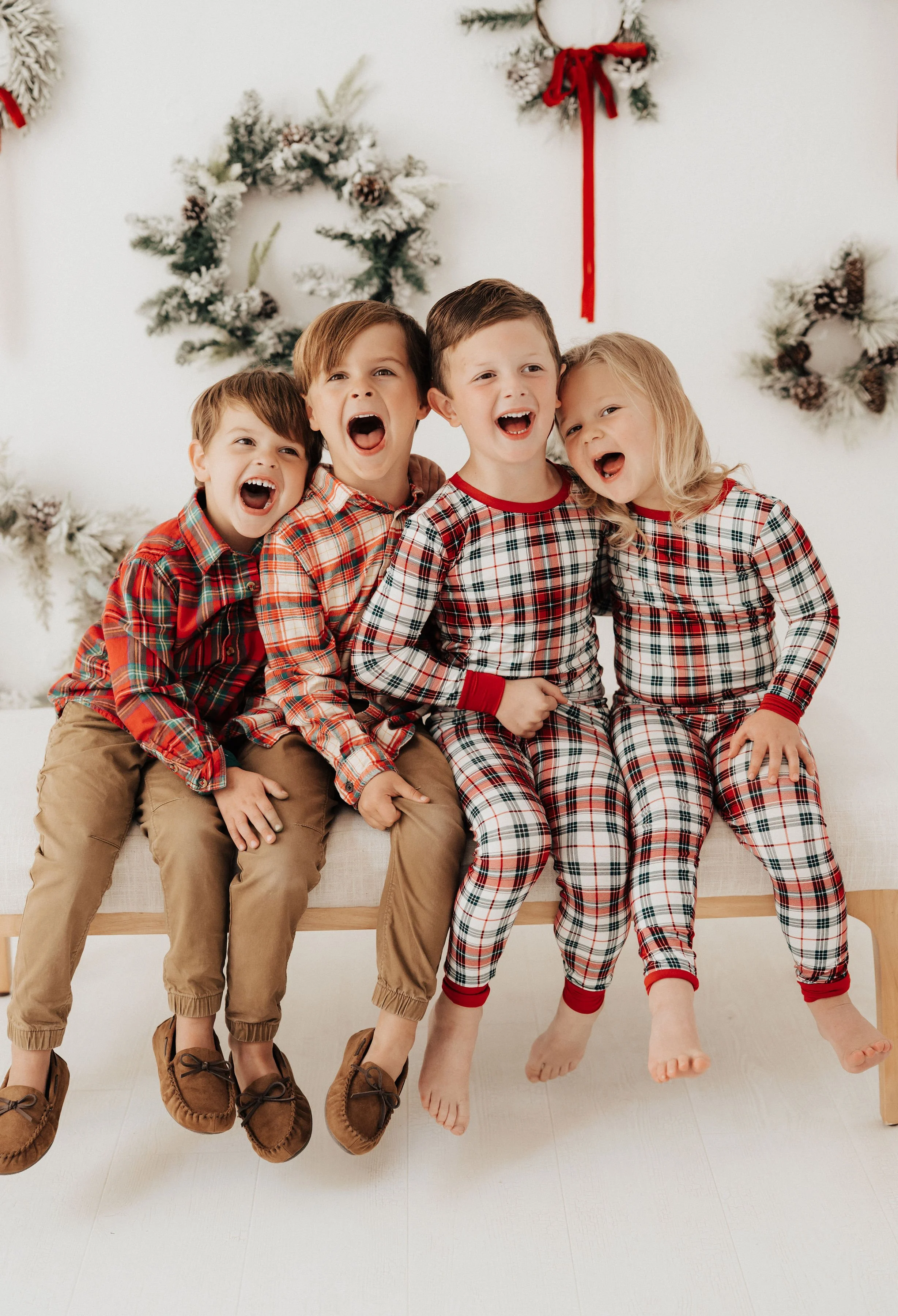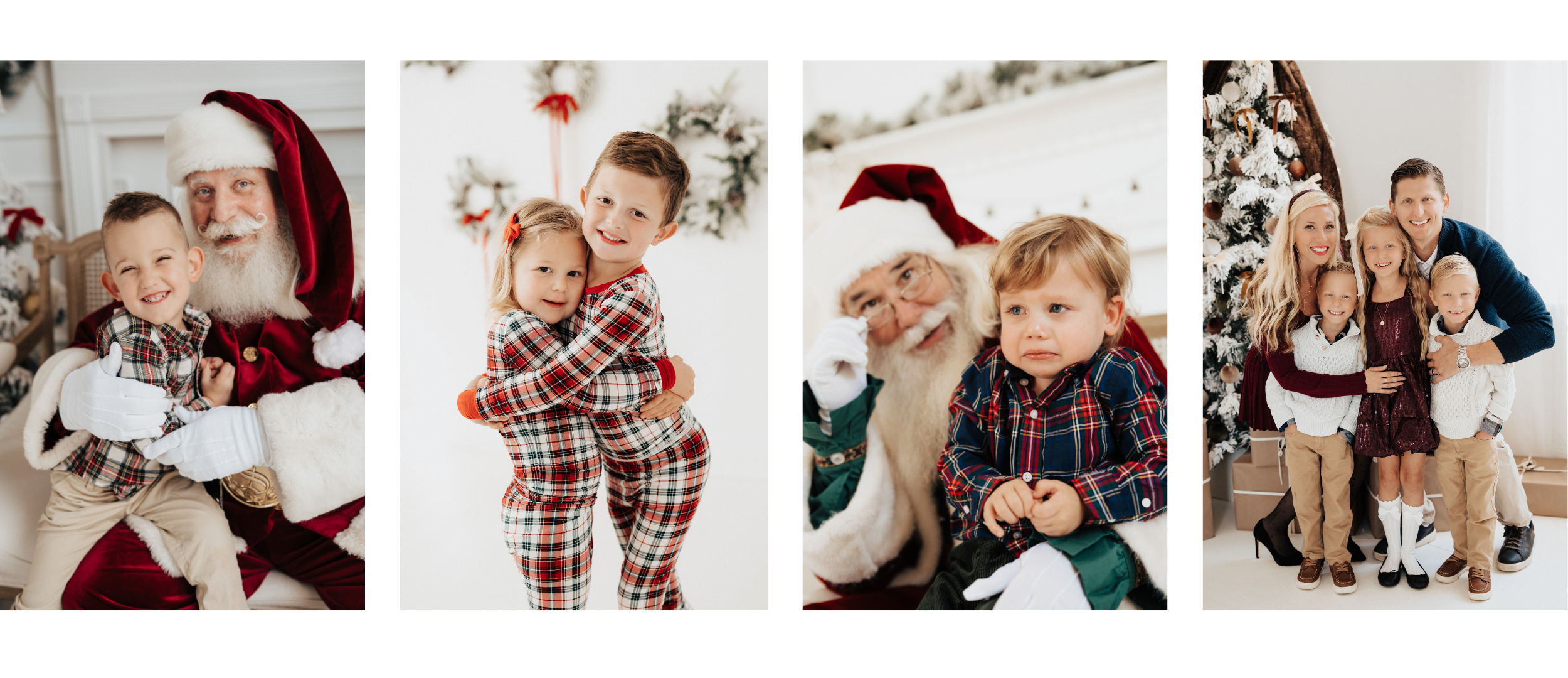 Festive outfits are fun, but I recommend avoiding red—it can clash with Santa (see our photo examples!). I’ll send out a style guide and lookbook once the set is finalized to help you dress your kiddos. Neutrals with festive touches and textures work best, and PJs are always welcome!